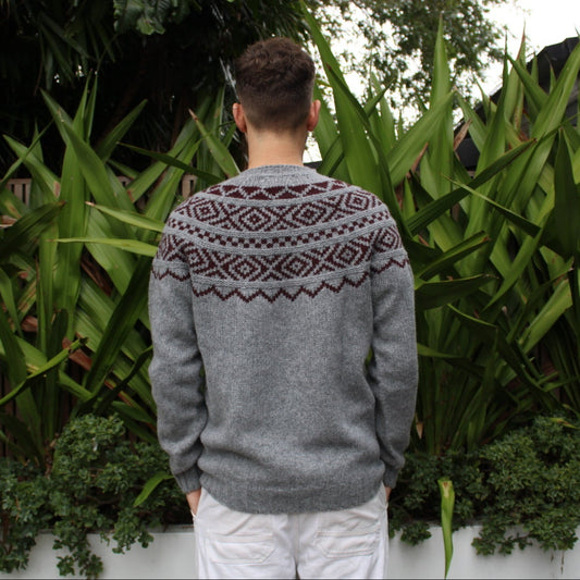 Harley of Scotland - Men's Shetland Fairisle Sweater - Grey/Beetroot