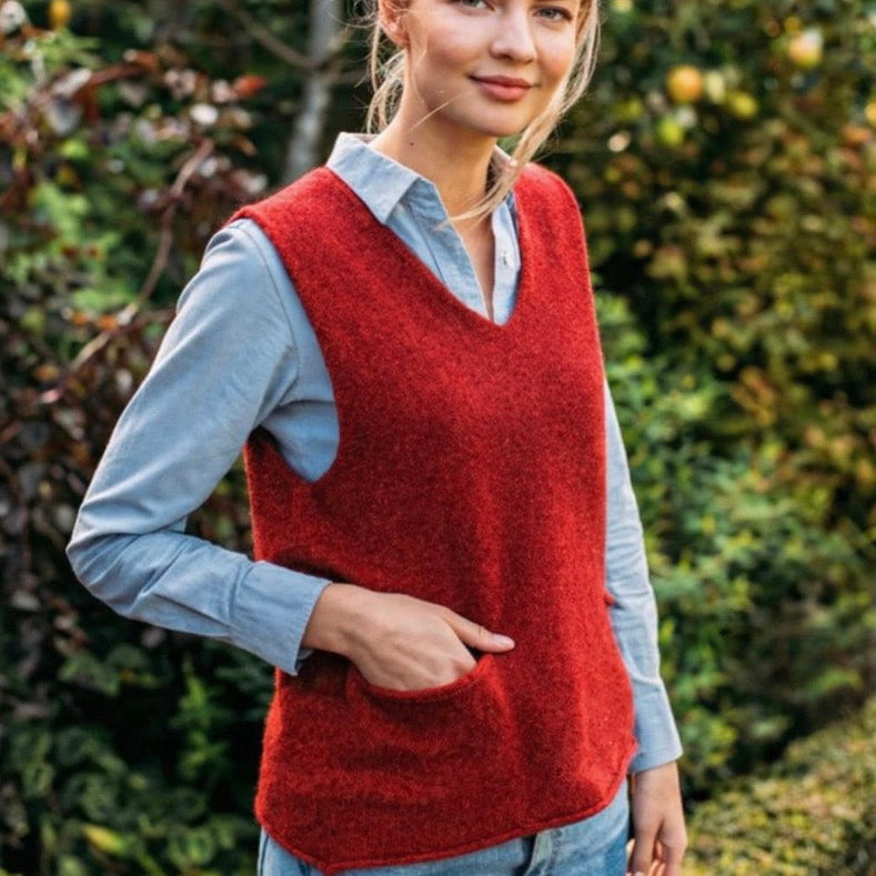 Eribé is a classic knitwear piece. It is knitted from premium quality, slightly felted Merino lambswool, making it ideal for cooler weather. This women's vest is both soft and warm with a deep vee neck. It features rolled trims and has two pockets and a relaxed fit, meaning it is the perfect knitted vest for everyday wear. Made in Scotland, it is a piece which will last for years to come.