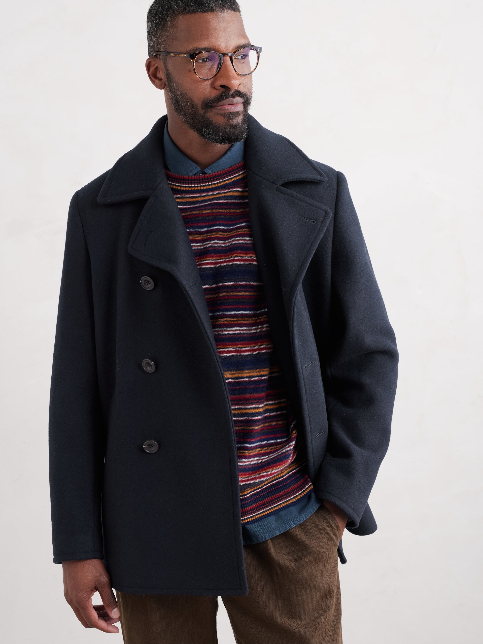 A classic double-breasted winter coat, made from a warm wool blend from Seasalt Cornwall. The deep notched collar, mock-horn buttons and jet pockets are a similar to the traditional mariner's coats, while deep split at the back and smooth lining make for easy movement.
