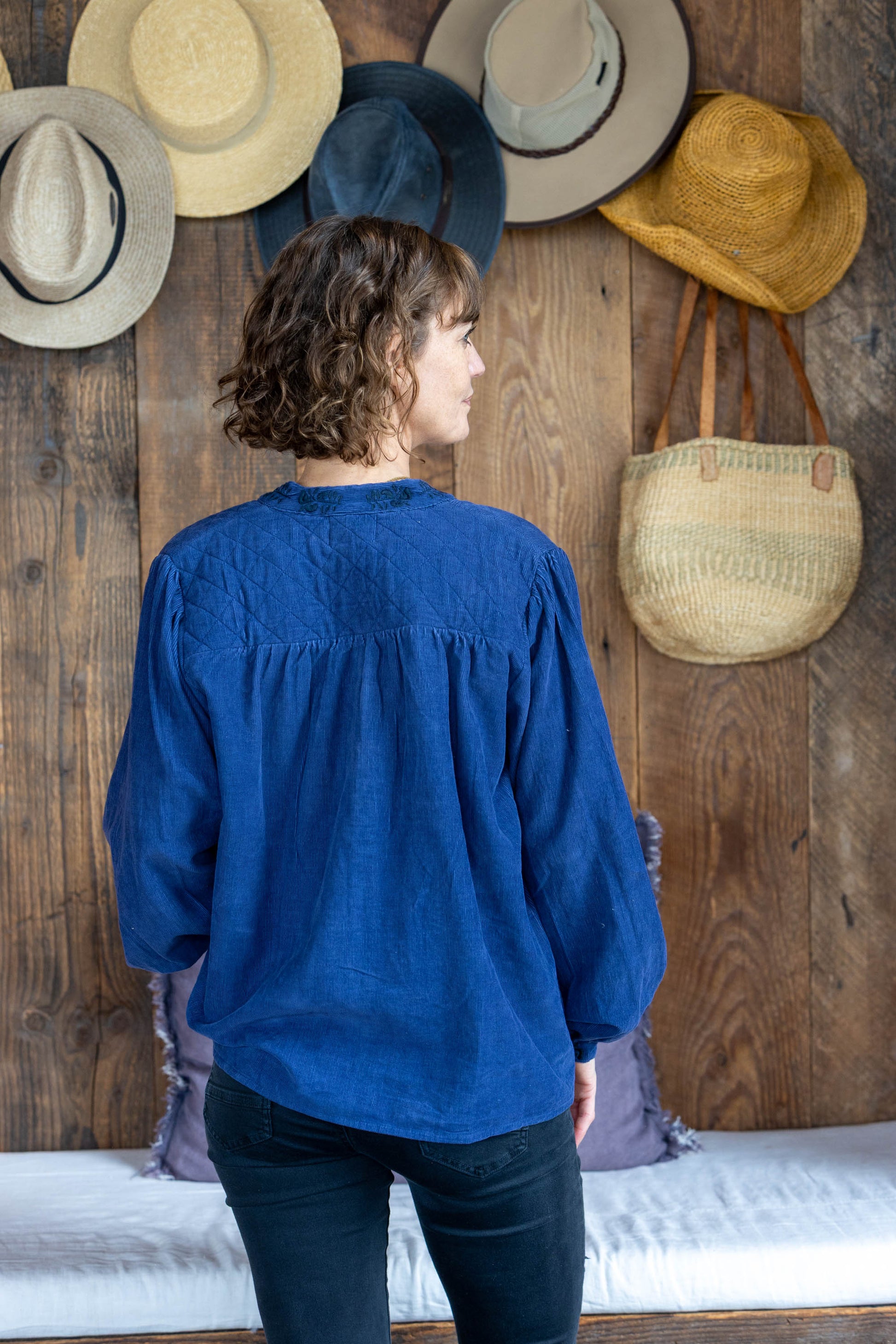 The Vines Cord Shirt is fabulous! A loose fitting collarless shirt made from pinwale cord, with stitching detail, padding detail, embroidery and sweet flower shaped coconut buttons! A winter shirt that will go over pants or a skirt and unbuttoned becomes a jacket. A versatile style with heaps of character. Sizing is big XS/S = 10/12, S/M = 14/16, L/XL = 18 +